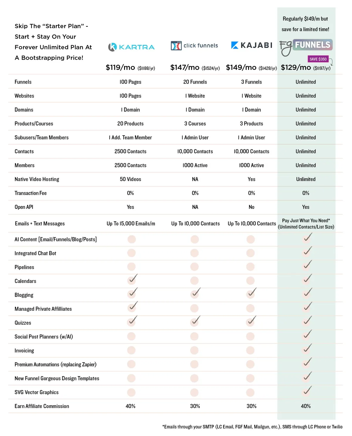 Secondly, NO limits on # of contacts, domains, pages, courses, automations, pipelines, etc. None. This is a limited time offer we’re selling and means we get to grow with you.
