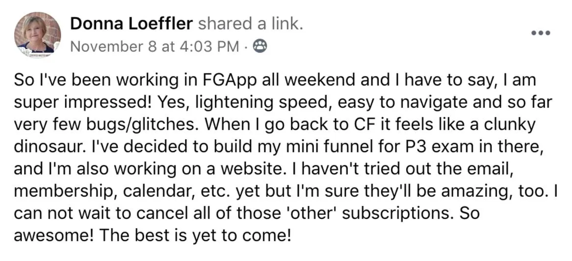 Third, having tried every other software out there (trust us), we’ve never seen anything as good as FG Funnels®. Yes, Really.